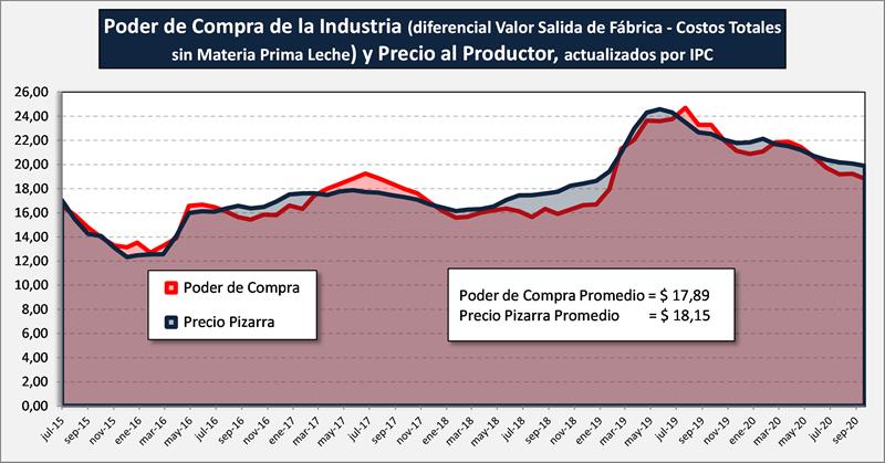Viendo el precio pizarra liquidado y comparado con la capacidad de pago promedio de la industria, actualizada por IPC, para un período más prolongado, puede observarse que en el largo plazo (salvo oscilaciones temporales) los valores promedio convergen: $ 18,15 por litro de Precio Pizarra y $ 17,89 por litro de Poder de Compra.