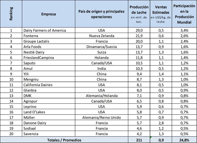 Las Top-20 recogen 211 Millones de toneladas de leche (datos 2019), lo que supone el 25% de la leche producida en todo el mundo, de acuerdo con los datos de IFCN, que cada 2 años elabora esta lista. Con respecto a 2017, los Top 20 en 2019 han mantenido estable su recoleccjón de leche. Con respecto al período 4/12/2020 las Top-20 de la industria láctea mundial registran un EBITDA medio del 8% en los últimos 5 años (2014-2019), la recolección de leche de las Top-20 ha aumentado en un 2,4%, en línea con el crecimiento de la producción láctea mundial.