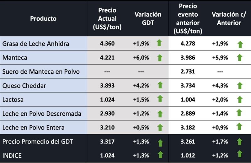 -GDT Price Index indica el promedio del cambio porcentual en los precios para cada especificación, ponderado por la cantidad de cada especificación vendida. GDT proporciona un cambio en el índice de precios de GDT del evento anterior para todos los productos, además de un equivalente para cada grupo de productos y cada combinación de grupo de productos/período de contrato. El índice de precios proporciona un reflejo más preciso de los movimientos de precios entre los eventos comerciales.