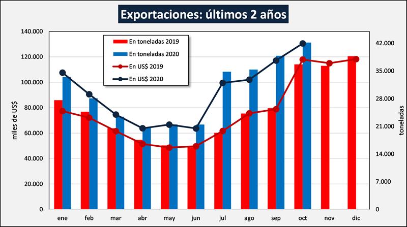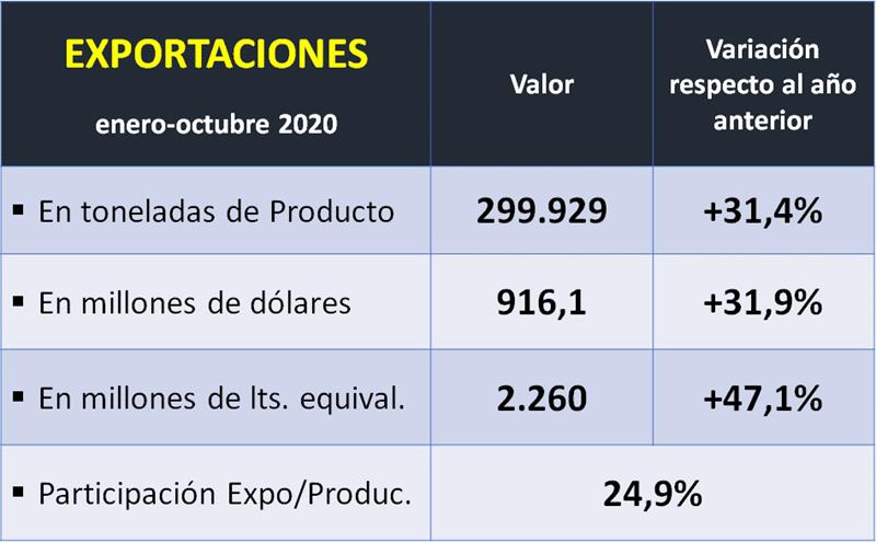 La variación intermensual de las exportaciones de octubre 2020 respecto a septiembre, fue de +8,6% en volumen y +11,5% en valor. Por su parte las variaciones interanuales para octubre fueron +15,0% en volumen y +10,7% en US$.