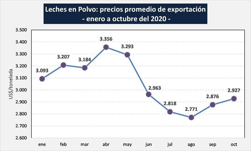 En lo que respecta a las leches en polvo enteras general, en el período enero-octubre del 2020 crecieron en volumen un 68,8%, en monto total en dólares un 68,9% y el valor unitario promedio, mejoró en dólares un 0,1%. Los precios de nuestro principal producto de exportación, las leches en polvo enteras, tuvieron para el período enero-octubre de éste año la siguiente evolución que se observa en el gráfico de abajo: