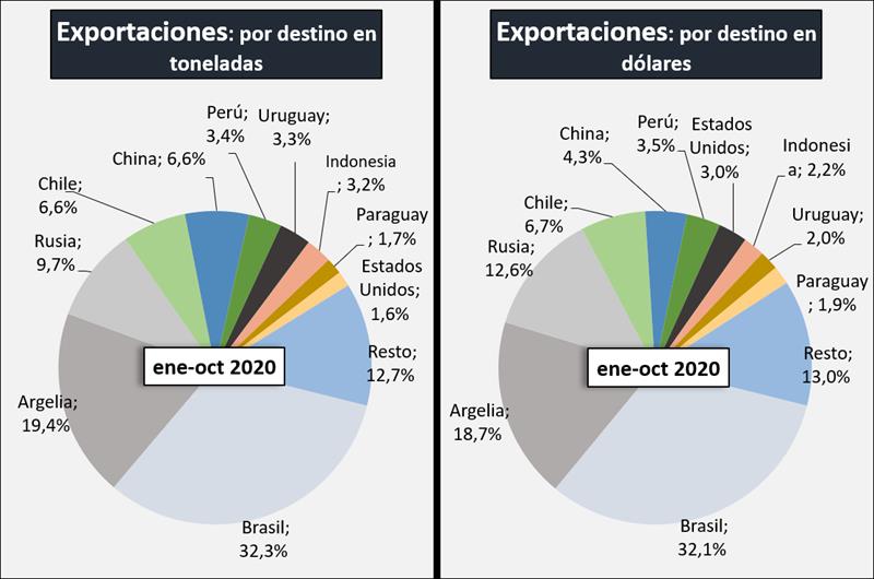 El principal destino de nuestras exportaciones continúa siendo Brasil, con algo más de un 32% tanto en cantidad de productos como en dólares, seguido por Argelia, y luego un poco más distante, pero manteniendo una participación importante, Rusia.