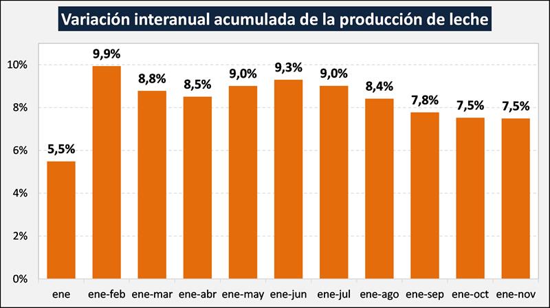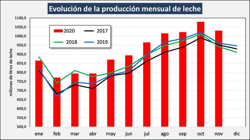 En el mes de noviembre del 2020 la producción fue de 1.030,4 millones de litros de leche, esto implica un valor 4,5% por debajo del mes anterior (si consideramos el promedio diario de producción la reducción fue del 1,3%) y un 7,2% más que igual mes del año anterior. El acumulado de los últimos 12 meses tiene un incremento del 7,2%, lo cual muestra la tendencia al crecimiento entre 2019 y la perspectiva 2020.