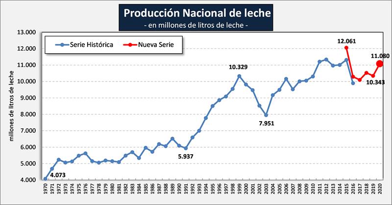 De concretarse el valor mencionado anteriormente para la producción del año 2020, así quedaría la curva de evolución histórica de la producción de leche en Argentina: