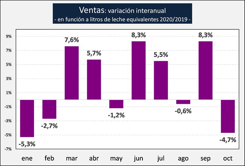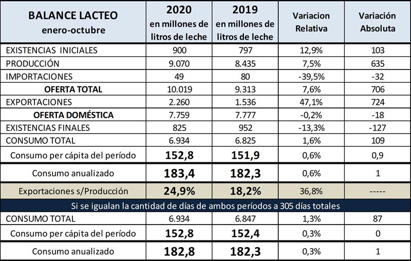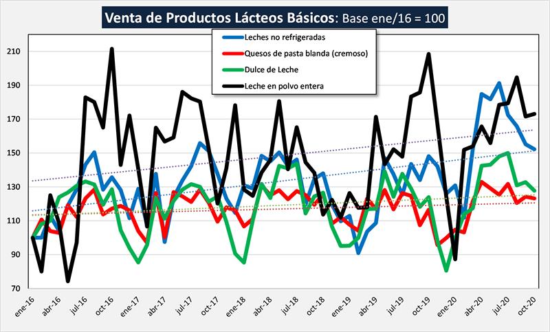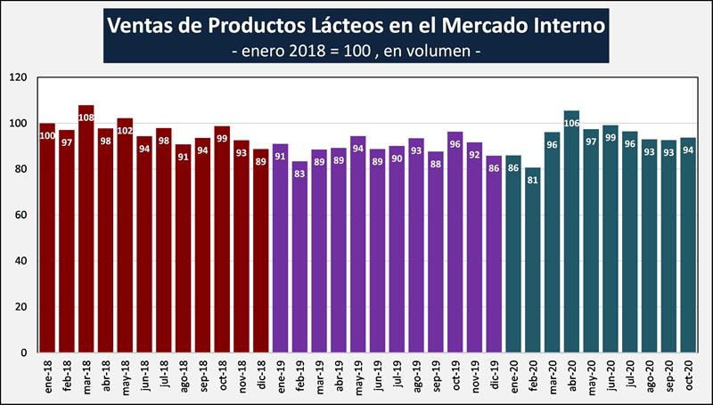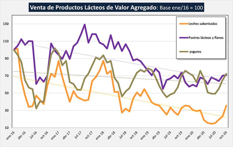 Ventas de Productos Lácteos en el Mercado Interno – octubre 2020 27/12/2020Venta de Productos Lácteos en el Mercado Interno: La información proviene del Panel de industrias lácteas establecido a partir del relevamiento coyuntural de la Resolución 230/16 e información histórica de la Resolución 7/14, ambas de la SAGyP. Los valores se expresan en toneladas y miles de litros, dependiendo del tipo de producto. La conversión a litros de leche equivalente se realiza con los coeficientes establecidos en la Disposición 1/2018 de la DNL-MPyT. ![]() En el cuadro se observa un volumen de ventas superior en un 4,2% en productos y 2,4% en litros de leche equivalentes respecto a igual período del año anterior. Claramente podemos ver cómo crecen las ventas de productos más básicos como leches no refrigeradas, leches en polvo, quesos cremosos (pasta blanda), manteca, dulce de leche y yogures, que en general caen, pero aumentan las ventas en bebibles de litro (presentación predominante en la categoría). Por otro lado, los productos de mayor valor agregado y/o unitario, como yogures en potes, flanes y postres, leches saborizadas, quesos duros y semiduros presentan caídas importantes. Lamentablemente, todos estos últimos son los que aportan mayor contribución marginal al negocio de la cadena industrial y por ende su posible traslación al sector primario. Si procedemos a analizar la evolución de las ventas mes a mes en su comparación interanual, y lo hacemos por la unidad de medida comparable que son los litros de leche equivalentes (litros necesarios para producir los productos elaborados), vemos un comportamiento muy irregular como muchos altibajos. El sostenimiento del consumo, incluso con valores levemente por encima del año pasado, responde básicamente a las ayudas sociales en todas sus formas (AUH, tarjeta alimentaria, IFE, etc.), que se destinaron a un consumo de lácteos más básicos y a las mayores compras de los diferentes gobiernos nacional, provinciales y municipales de leches fluidas y en polvo para asistencia alimentaria. ![]() Ha habido un cambio importante en las compras de productos lácteos, donde se hacen en forma más puntual, en negocios de cercanía y mayoristas, de mayor valor (canastos más grandes), con menor frecuencia en las misma (menos visitas). Producto de las compras para stock familiar y por los controles de precios (máximos y cuidados), se visualiza un incremento significativo en las leches no refrigeradas y una situación similar en manteca, dulce de leche, quesos cremosos y yogures bebibles de litro. En los gráficos siguientes se visualiza claramente la tendencia de aumento en el consumo de productos más básicos en detrimento de productos de mayor valor agregado. Esta tendencia ya lleva un tiempo prolongado y se debe fundamentalmente a un fuerte deterioro en el poder adquisitivo de los sectores medios de la pirámide de ingresos: ![]() ![]() En base al Balance Lácteo estimado por OCLA a octubre del 2020 surge un consumo total del 1,6% superior al año anterior, el consumo per cápita acumulado hasta octubre del 2020 es de 152,8 litros/habitante de leche equivalente, versus 151,9 en igual período de 2019 (+0,6%). Si anualizamos el consumo per cápita corregido por igual cantidad de días entre años, el consumo para 2020 sería de 182,8 litros/habitante y por año, es decir un 0,3% superior al 2019. Las cifras que arroja la metodología del Balance Lácteo son muy similares a las de ventas totales del cuadro superior (Resolución 230/16), recordando que estas son una muestra de la población total y el mayor volumen de ventas/consumo de la muestra (+2,4%) respecto al Balance Lácteo (+1,6%) responde muy probablemente a un menor volumen de venta de las industrias más pequeñas que están fuera del muestreo de la Resolución 230/16. ![]() Respecto a los datos que captura la Resolución 230/16 es el de aquellas empresas que muy probablemente hallan incrementado sus ventas en los meses de pandemia/cuarentena y las industrias que han sufrido fuertes caídas en sus ventas (incluso algunas que dejaron de procesar) no estén registradas ni en el período previo ni durante la cuarentena y por lo tanto estas cifras pueden indicar un nivel de ventas superior al real de todo el mercado (100% de la leche procesada y comercializada en el mercado doméstico). Otro dato relevante, corresponde a leches no refrigeradas ya que en la muestra hay una empresa con datos completos en el período ene-oct 2020 pero que no cuenta con datos completos en el año anterior. Evolución mensual de las Ventas en el Mercado Interno por grupo de productos ![]() Evolución de las Ventas en el Mercado Interno en base a productos totales y tomando como Base = 100 enero de 2018 ![]() elaborado por el OCLA con información de INDEC y DNL-MAGyP
