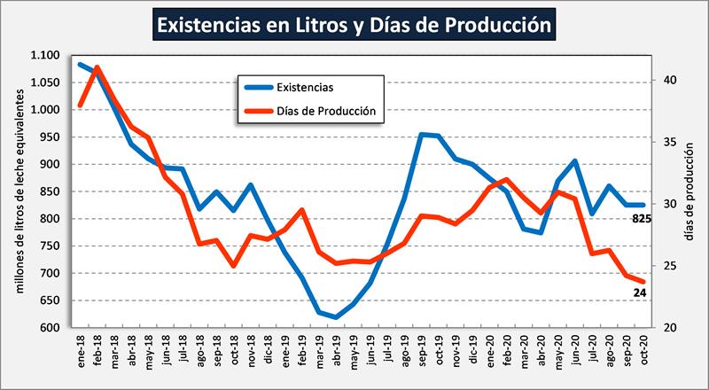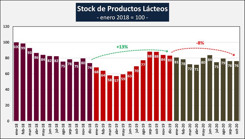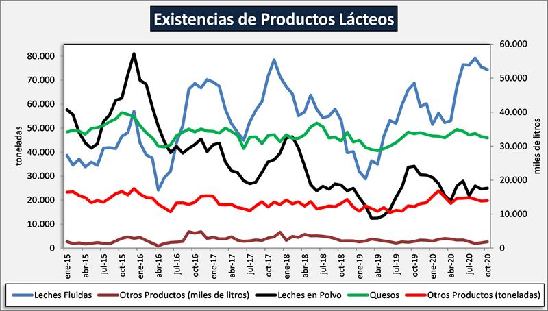 Existencias de Productos Lácteos – octubre 2020 29/12/2020Existencias de Productos Lácteos: La información proviene del Panel de industrias lácteas establecido a partir del relevamiento coyuntural de la Resolución 230/16 e información histórica de la Resolución 7/14, ambas de la SAGyP. Los valores se expresan en toneladas y miles de litros, dependiendo del tipo de producto. La conversión a litros de leche equivalente se realiza con los coeficientes establecidos en la Disposición 1/2018 de la DNL-MPyT. ![]() En el cuadro se observa un aumento en las existencias del 2,5% en octubre del 2020 en volumen de productos (toneladas y miles de litros) y un menor stock del 8,3% en litros de leche equivalentes, respecto al cierre del año anterior e inicio de este. Se puede visualizar un aumento significativo de las existencias de leches no refrigeradas. Por su parte la leche en polvo entera (nuestro principal producto de exportación) presenta un stock 24,6% por debajo de inicios del año, 1,9% por debajo del mes anterior (en promedio diario) y -26,9% respecto a igual mese del año anterior. A pesar del incremento significativo de la producción de leche y de los stocks iniciales, el principal producto de exportación (algo mas del 50% del total exportado) viene cayendo fuertemente en los stocks debido al gran incremento de las exportaciones. ![]() El gráfico anterior se construye sobre la base de los litros de leche equivalentes que hay en existencias en cada mes en los últimos 3 años, tomando a enero 2018 como base 100, puede observarse que el año 2020 comenzó con 13% más de stocks que el año anterior y que ese stocks inicial fue disminuyendo un 8% hasta el mes de octubre. La mayor producción y los mayores stocks iniciales, se destinaron en su totalidad a cubrir la creciente exportación, ya que el consumo doméstico estuvo muy levemente por encima del 2019 y se redujeron stocks. Según información sectorial especializada, las necesidades de caja y la imposibilidad de sostener stocks por su alto costo de financiamiento (con casi nulas herramientas para llevarlo a cabo a tasas y plazos razonables), la mayor producción se destino al mercado externo, con precios que no fueron lo suficientemente atractivos para Argentina, ya que además de no contar con preferencias arancelarias en mercados extra mercosur, nuestras exportaciones están gravadas con derechos de exportación y poseen muy bajos reintegros de impuestos internos. Por lo que todo ello generó malos resultados económicos para el sector industrial y un insuficiente precio de la leche al productor (precio real por debajo del precio de equilibrio). ![]() En lo que respecta al mes de octubre en particular, las existencias son -3,0% en productos y -13,3% en litros de leche equivalentes, inferiores que octubre del año anterior, y representan 24 días de producción, 5 días menos que octubre del año pasado. ![]() elaborado por el OCLA con información de INDEC y DNL-MAGyP