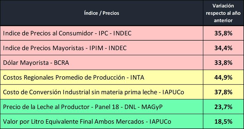 En el cuadro siguiente se muestra la evolución interanual de los índices de precio de la economía, los costos de ambos eslabones de la cadena y el precio tanto del mix de productos elaborados como de la leche al productor. Es evidente el retraso de precios de los productos terminados y de la materia prima leche, entre el 15 y 20%.