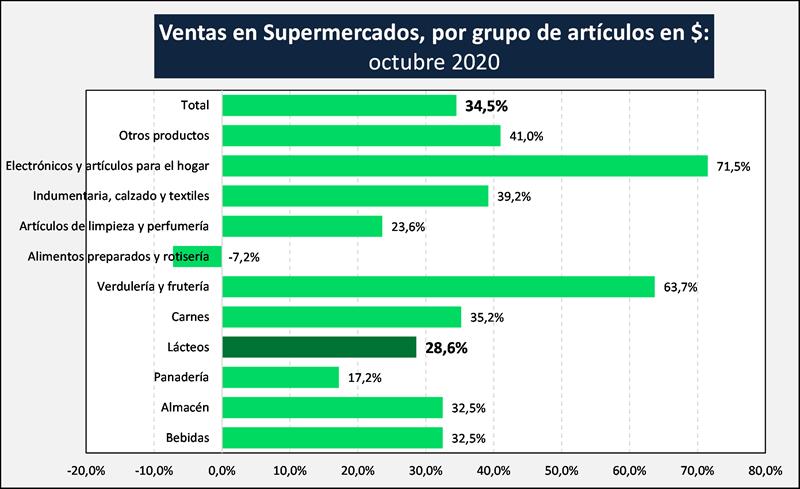 Respecto a las ventas de lácteos en los supermercados según los datos de INDEC, fueron de $ 10.232,7 millones para el mes de octubre del 2020, lo que representa un aumento del 5,1% en el promedio diario respecto al mes anterior y un incremento del 28,6% más que octubre de 2019 (la inflación-IPC fue del 3,8% y 37,2%, respecto al mes anterior y anual, respectivamente).