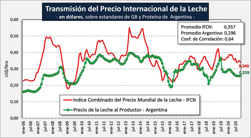 Cálculo: 35% del indicador IFCN, precio mundial de la Leche en polvo descremada y la manteca, + 45% del indicador IFCN, precio mundial del Queso y del Suero de leche, + 20% del indicador IFCN, precio mundial de la Leche en polvo entera.