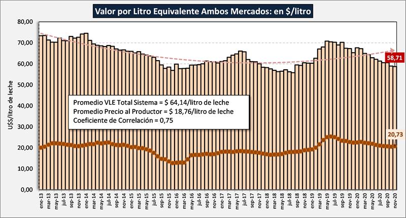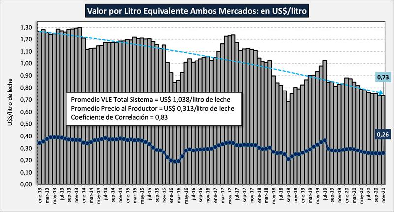 El ingreso por litro de leche equivalente en ambos mercados (VLE) obtenido en noviembre del 2020 por la totalidad de productos (mercado intero y externo) fue de US$ 0,73/litro, cuando el promedio histórico disponible (enero 2013 a noviembre 2020) fue de US$ 1,04/litro, lo que implica una disminución en la recaudación total de la cadena de US$ 0,31/litro de leche equivalente. Por lo tanto, con la base de distribución relativa de la cadena observada en noviembre, 35,3% producción primaria y 30,3% industria, generarían un adicional de US$ 0,11/litro para el sector primario y US$ 0,09 para el sector industrial.