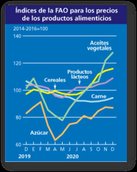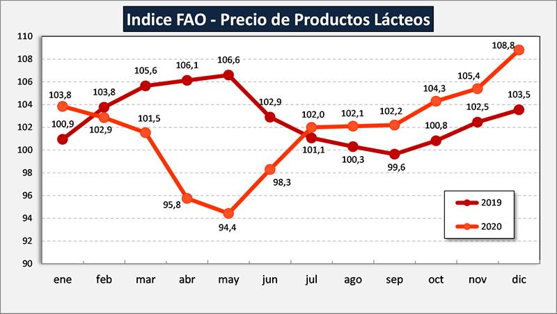 El índice de precios de los productos lácteos de la FAO se situó en un promedio de 108,8 puntos en diciembre, esto es, 3,4 puntos (un 3,2 %) más que en noviembre, lo que representa la séptima subida mensual consecutiva. En diciembre aumentaron los precios internacionales de todos los productos lácteos que constituyen el índice, sustentados por una fuerte demanda mundial de importaciones, principalmente como resultado de preocupaciones acerca de las repercusiones negativas de las condiciones atmosféricas más secas y cálidas en la producción lechera de Oceanía. La gran demanda interna y la escasa producción de algunos productos lácteos en Europa occidental también sostuvieron los precios. Sin embargo, en lo que respecta a 2020 en su conjunto, el índice de precios de los productos lácteos de la FAO alcanzó un promedio de 101,8 puntos, lo que supone una reducción de 1,0 puntos (un 1,0 %) respecto de 2019. Entre los distintos productos lácteos, los precios de la manteca registraron la caída más pronunciada, seguidos por los de la leche entera en polvo, mientras que los precios de la leche desnatada en polvo y del queso aumentaron.