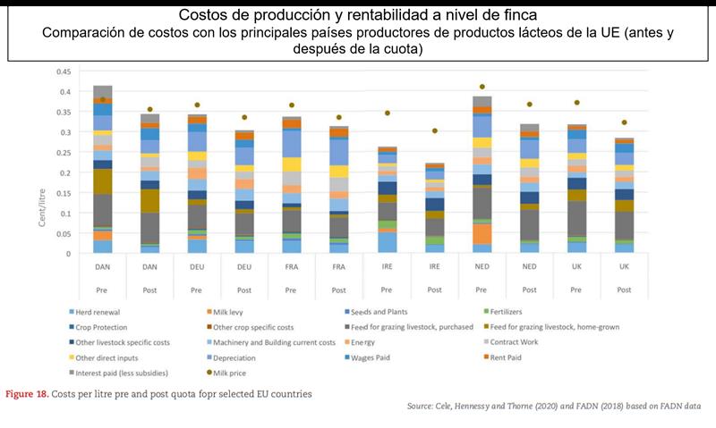 De media, los costos de producción (excluida la mano de obra propia) fueron de 0,38 €/litro en Dinamarca, 0,35 €/litro en Holanda, 0,33 €/litro en Francia, 0,32 €/litro en Alemania, 0,30 €/litro en Reino Unido y 0,24 €/litro en Irlanda (US$ 0,44 - 0,40 – 0,38 – 0,37 – 0,35 y 0,28 respectivamente)