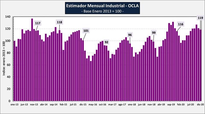 El EMI-OCLA asciende en diciembre del 2020 al valor 118,6 que es 5,1% inferior al mes anterior (promedio diario) y +2,2% respecto a igual mes del año anterior (a pesar que el volumen de producción fue superior en un 6,9%). Desde que se analiza este indicador (96 meses), el promedio de los 7 meses de diciembre anteriores llega al valor índice 105,3 vs 118,6 actual (+12,7%) y no se observa ningún valor superior al actual del 2020.