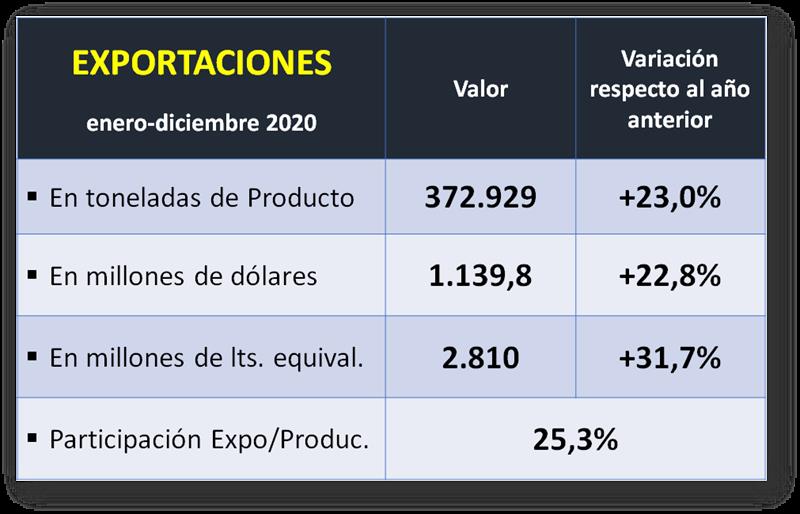 La variación intermensual de las exportaciones de diciembre 2020 respecto a noviembre, fue de -37,5% en volumen y -32,6% en valor. Por su parte las variaciones interanuales para diciembre fueron -29,5% en volumen y -25,8% en US$.