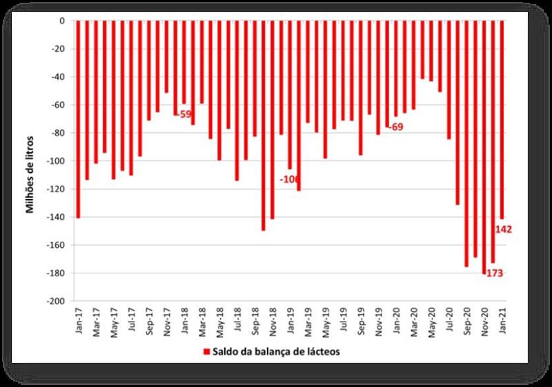 Según datos difundidos por la Secretaría de Comercio Exterior (SECEX), las importaciones brasileñas de productos lácteos mostraron, en enero, el nivel más bajo desde agosto/20. En total, se importaron alrededor de 149 millones de litros de leche equivalente en el mes, una disminución del 18% con relación a diciembre/2020. Esta es la opinión del vaso “medio lleno” sobre el tema de la importación.