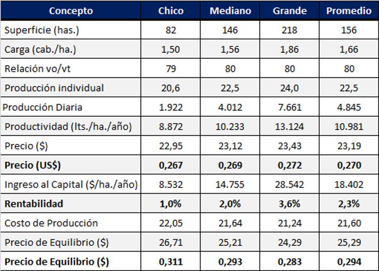 Si suponemos una tasa de rentabilidad exigida al capital del 5%, se debería generar un Ingreso Neto por hectárea que dividido por los 7.950 litros de leche de productividad promedio, deberían generar un valor de costo de oportunidad al capital promedio operado de $ 3,91/litro de leche. Por lo tanto, el Precio de Equilibrio sería en este supuesto de $ 27,58/litro de leche ($ 23,67 de Costo Total + $ 3,91 de Rentabilidad al Capital), unos US$ 0,321/litro.