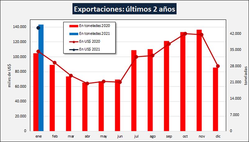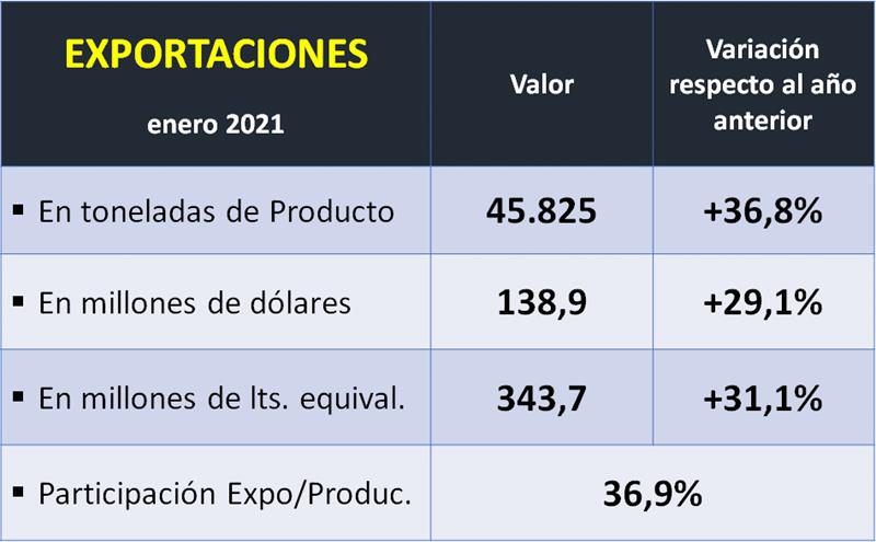 La variación intermensual de las exportaciones fue +67,7% en volumen y +58,5,% en valor (ene/21 vs. dic/20). La variación interanual de enero 2021 fue de +36,8% en volumen y +29,1% en valor (ene/21 vs. ene/20).