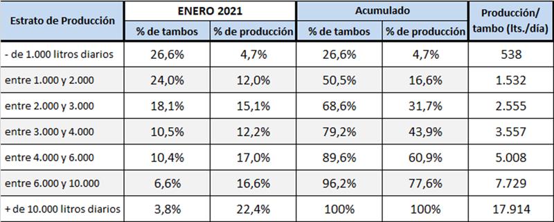 Puede observarse que los aproximadamente 380 tambos del estrato de + de 10.000 litros de producción diaria, que produjeron durante el mes de enero un promedio de 17.914 litros diarios, representan el 3,8% del total de tambos y aportan el 22,4% de la producción total. Esto es casi un 35% mas de leche qué la que aportan los casi 5.000 tambos de menos de 2.000 litros diarios y que son el 50,5% de los tambos totales, que representan el 16,6% de la producción nacional.