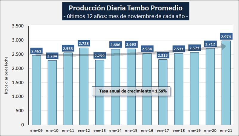 Sobre la base de la producción mensual y la cantidad anual de tambos (SENASA), podemos inferir el tamaño del tambo promedio, unos 2.974 litros de leche diarios para enero del 2021, un 9,7% más que el año anterior. Si evaluamos su comportamiento en el tiempo, a pesar de la disminución en el número de unidades productivas y en el número de vacas, el tambo promedio presenta en el período 2009-2021 una tasa de crecimiento acumulada anual del 1,59%, lo que permite, a pesar de la reducción en las unidades productivas y en el rodeo, el sostenimiento de los niveles productivos agregados a nivel país.