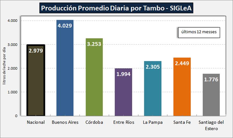 La producción promedio diaria por tambo y por provincia que graficamos aquí es la que arrojan los datos de SIGLeA – LUME sobre 8.179 liquidaciones de leche mensuales (352 industrias).