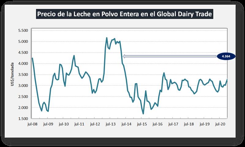 En la última subasta del GDT del día 02/03/21 se dio una suba no prevista, donde el índice promedio creció un 15% y la leche en polvo entera, nuestro principal producto destinado al mercado internacional (52% del valor de nuestras exportaciones) tocó el valor de US$ 4.364/ton., el más alto de los últimos 7 años (ver gráfico de abajo).