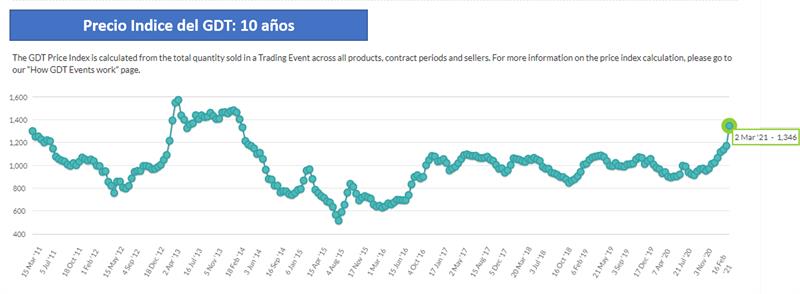 Los precios de los productos lácteos aumentaron drásticamente en la primera subasta de marzo (02/03/21), con el precio de la LPE subiendo un 21% y la manteca un 14%, lo que facilitó un aumento del 15% en el índice general de precios GDT.