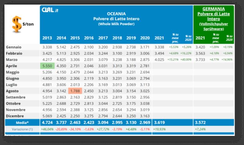 Esta tendencia fue anticipada por el evento Global Dairy Trade el 2 de marzo, que registró un aumento del precio promedio del + 15,0%. Posteriormente, el último evento del GDT el 16 de marzo registró un cambio en el precio promedio de -3,8% respecto al evento anterior. Las variaciones para LPE (-6,2%) y Manteca (-2,8%) fueron negativas, mientras que LPD y Cheddar se mantuvieron sustancialmente estables. Sin embargo, los precios medios se mantienen por encima de los niveles de febrero.