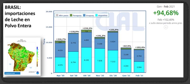 Las importaciones de leche en polvo de Brasil continúan aumentando a un ritmo rápido. En el período enero - febrero registró variaciones de + 94,7% para el LPE y + 101,6% para el LPD, respecto al mismo período del año anterior.