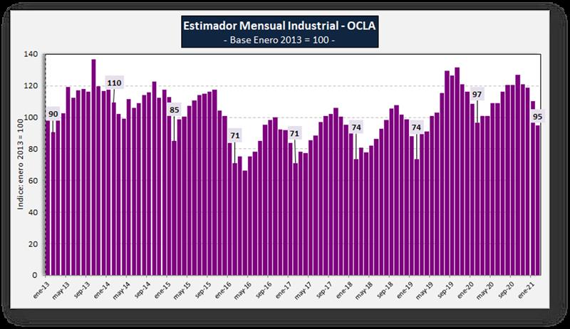 Estimador Mensual Industria Láctea - OCLA 1/4/2021![]() El EMI-OCLA asciende en febrero del 2021 al valor 94,9 que es 4,5% inferior al mes anterior (promedio diario) y +1,7% respecto a igual mes del año anterior, a pesar que el volumen de producción fue superior en un 5,8%, lo cual evidencia un menor valor unitario de los productos y/o un cambio en el mix. Desde que se analiza este indicador (98 meses), el promedio de los 8 meses de febrero anteriores llega al valor índice 84,0 vs 94,9 actual (+13% el actual) y sólo se observa un valor superior al actual en 2014 (teniendo en cuenta los promedios diarios). Metodología: Valor por Litro de Leche Equivalente (VLE) promedio de ambos mercados en Salida de Fábrica IAPUCo x Producción Mensual DNL x actualización con el Índice de Precios al Consumidor (IPC) INDEC. Del valor actualizado de salida de fábrica, se toma al mes de enero 2013 como base = 100 y de allí surgen el resto de los valores índice para cada mes. Todo el resto de la información de la Cadena de Valor en: https://www.ocla.org.ar/contents/newschart/portfolio/?categoryid=7 elaborado por el OCLA con información del IAPUCo