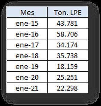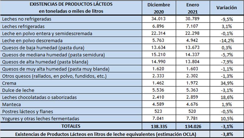 En el cuadro se observa una reducción en las existencias del 3,1% en enero del 2021 en volumen de productos (toneladas y miles de litros) y un menor stock del 3,8% en litros de leche equivalentes, respecto al cierre del año anterior.