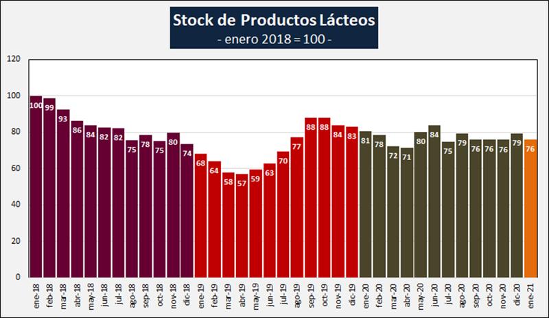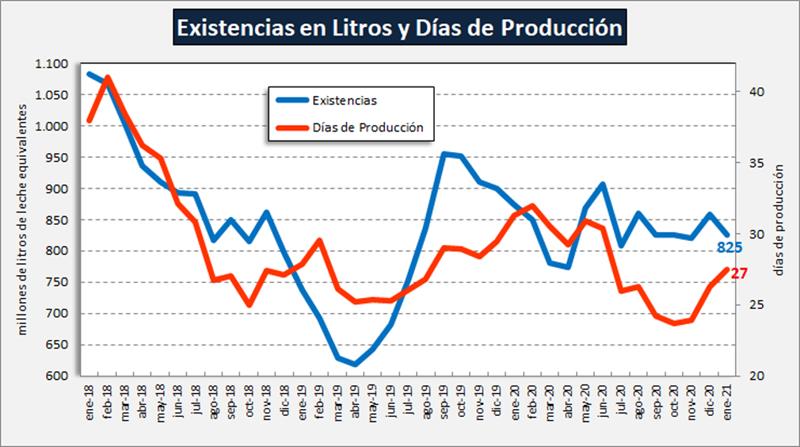 En lo que respecta al mes de enero 2021 en particular, las existencias son -5,6% en litros de leche equivalentes, inferiores que enero del año anterior, y representan 27 días de producción, 4 días menos que enero del año pasado.