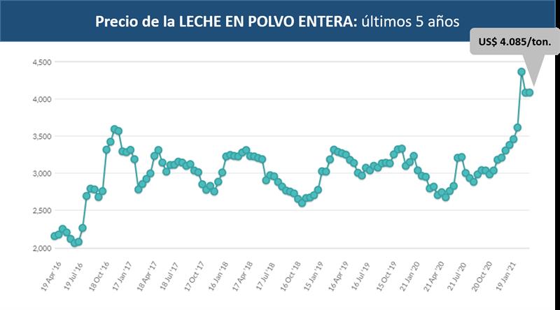En el Evento N° 280 del GDT (62/04/21) la leche en polvo entera (LPE) mantuvo prácticamente el valor de la subasta anterior y cerró en US$ 4.085/ton.