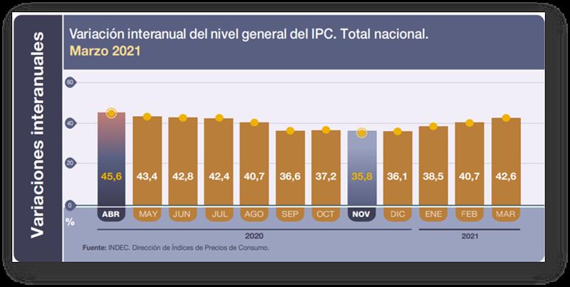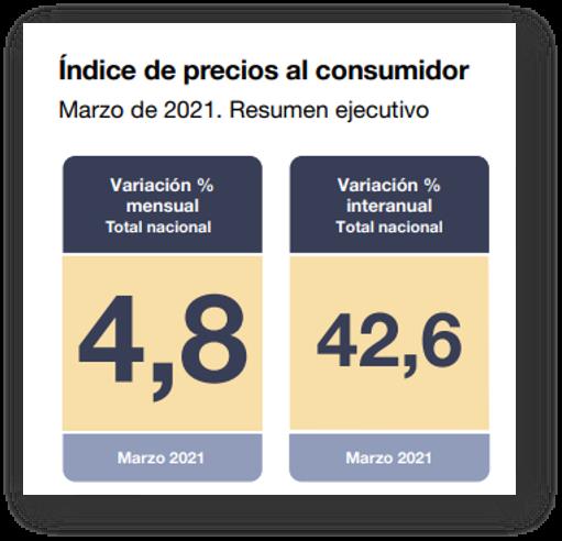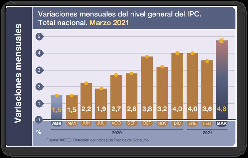 El nivel general del Índice de precios al consumidor (IPC) representativo del total de hogares del país registró en marzo una variación de 4,8% con relación al mes anterior y el acumulado anual fue del 42,6%.