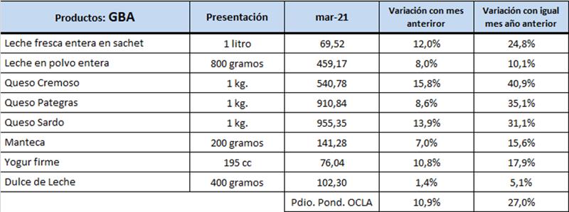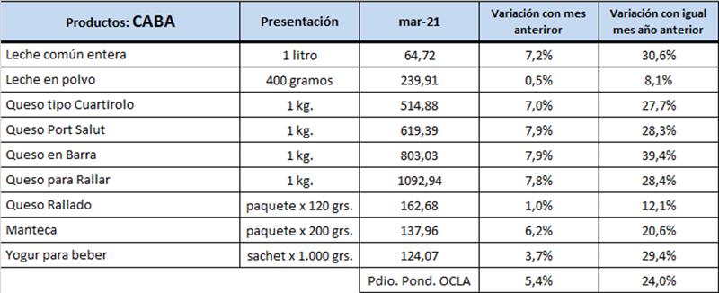 Según datos publicados por la Dirección General de Estadísticas y Censos - Ministerio de Hacienda del Gobierno de la Ciudad de Buenos Aires, los precios de los productos lácteos de esta canasta, tuvieron un crecimiento mensual promedio ponderado del 5,4% e interanual del 24,0%. El ponderado es elaborado por OCLA sobre el mismo criterio mencionado para la canasta GBA de INDEC.