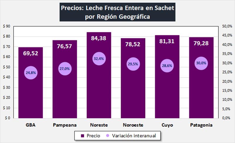 Se observa también en el análisis de los datos y con la información de Consultoras de mercado, que existe una gran dispersión de precios en función al canal y a la región, con precios más bajos en las grandes cadenas y ubicadas en la región central y precios más altos en negocios de menor tamaño y cercanía y ubicados en las regiones más alejadas de zona centro. El cuadro siguiente ejemplifica esta situación para leche fluida.