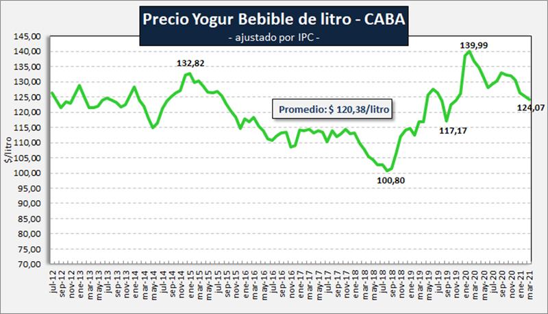 La situación de los yogures bebibles de litro es diferente, sostienen el nivel de consumo de la categoría, sus precios se ajustaron durante 2020 con el ritmo inflacionario, pero lamentablemente tiran para abajo el promedio del mix, ya que su aumento de ventas no fue acompañado por las ventas de yogures en pote, postres y flanes que tienen un mayor valor por litro equivalente.