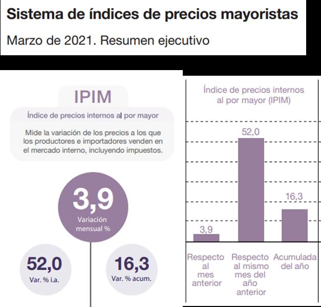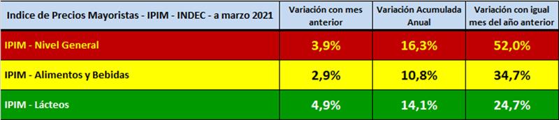 El nivel general del índice de precios internos al por mayor (IPIM) registró un aumento de 3,9% en marzo de 2021 respecto del mes anterior, un incremento del aumento del 16,3% en el primer trimestre del año y acumula una suba del 52,0% en los últimos 12 meses.