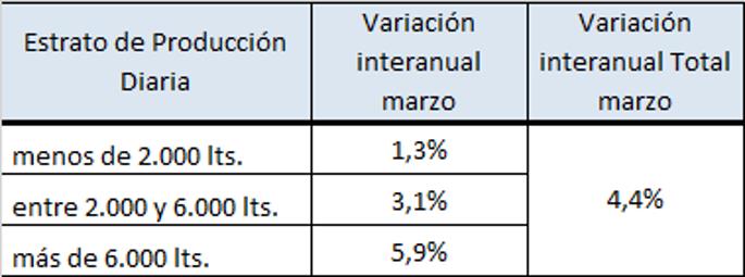 En el cuadro siguiente se puede observar que a medida que el estrato productivo es mayor, el crecimiento de la producción interanual también lo es. El estrato de mayor tamaño (+ de 6.000 lts.) crece bastante por encima del crecimiento medio de la producción, situación inversa para el estrato de menos de 2.000 litros diarios. Estos datos de crecimiento son a tambo constante entre marzo 2021 y marzo 2020.