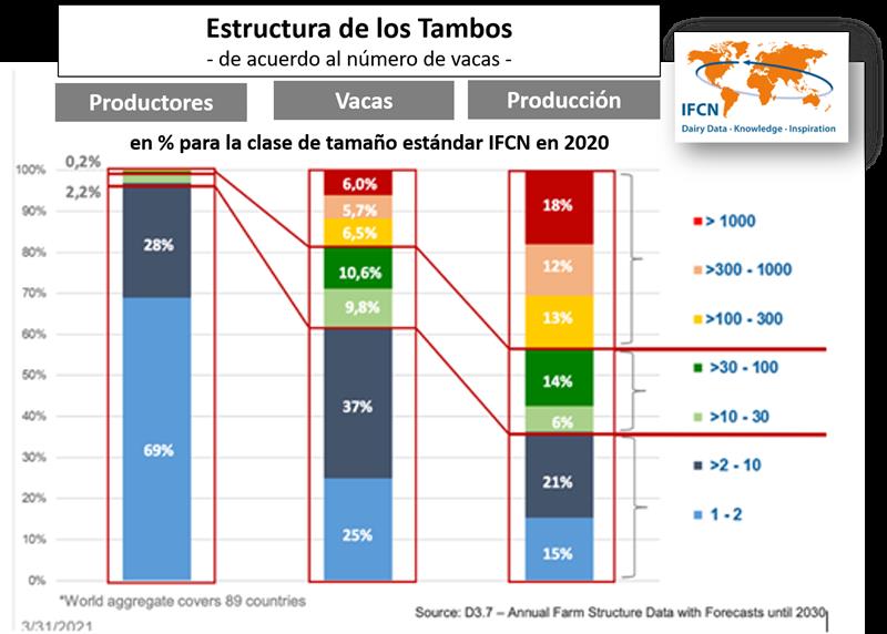Según un reporte del International Farm Comparison Network – IFCN, a partir del relevamiento que contempla 89 países, el 86% de los establecimientos lecheros y el 89% de la cantidad de vacas, puede observarse que los tambos con menos de 10 vacas representan el 97%, suman el 62% del total del rodeo y aportan el 36% de la producción total. En el otro extremo, los tambos con más de 100 animales representan menos del 1% de los establecimientos, pero producen alrededor del 44% de la leche con el 18% de los animales que conforman el rodeo mundial.