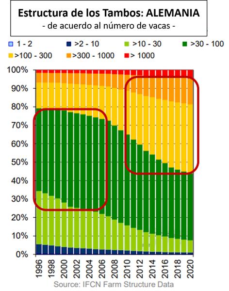 En el gráfico siguiente se puede ver la evolución histórica (1996-2020) de esta situación en Alemania, donde se nota claramente: 1) el incremento de la participación en el número total de vacas de los establecimientos de 100 a 300 de 301 a 1.000 y de más de 1.000 vacas, 2) la disminución en la participación en el total de vacas de las unidades productivas entre 30 y 100 vacas y 3) la brusca disminución en la participación de las unidades de menos de 30 vacas.
