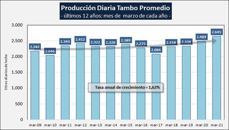 Sobre la base de la producción mensual y la cantidad anual de tambos (SENASA), podemos inferir el tamaño del tambo promedio, unos 2.645 litros de leche diarios para marzo del 2021, un 6,3% más que el año anterior. Si evaluamos su comportamiento en el tiempo, a pesar de la disminución en el número de unidades productivas y en el número de vacas, el tambo promedio presenta en el período 2009-2021 una tasa de crecimiento acumulada anual del 1,62% lo que permite, a pesar de la reducción en las unidades productivas y en el rodeo, el sostenimiento de los niveles productivos agregados a nivel país.
