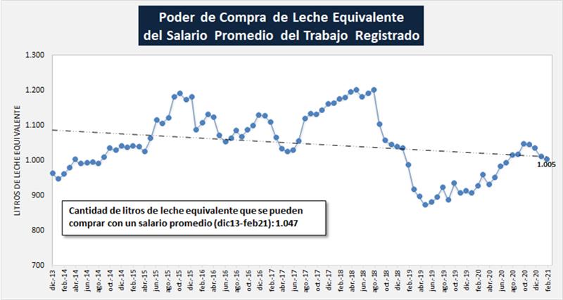 Para febrero 2021 ese valor llegó a 1.005 litros de leche equivalentes ($ 76.745 de Salario y $ 76,12 el VLE Mercado Interno), -0,7% respecto al mes pasado, +8,2% respecto a igual mes del año pasado y -4,0 respecto de la media de la serie (1.047).