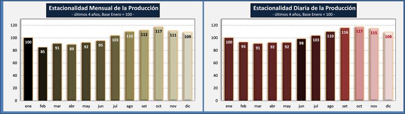 Como es habitual, la producción desde el pico de máxima en octubre, cae a una tasa del 5,5% mensual hasta marzo/abril (tomando el promedio diario de producción, para que no afecten la cantidad de días de cada mes), donde luego comienza un nuevo repunte hacia octubre.