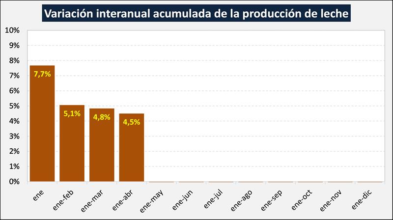 Abajo se puede ver la evolución de los denominados “sólidos útiles” (grasa butirosa y proteína), que crecieron el 4,6% en el acumulado enero-abril, incluso por encima del crecimiento de la producción medida en litros de leche (4,5%).