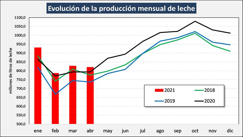 En el mes de abril del 2021 la producción fue de 821,2 millones de litros de leche, esto implica un valor -0,9% por debajo del mes anterior (+2,4% en promedio diario) y un 3,5% más que igual mes del año anterior.