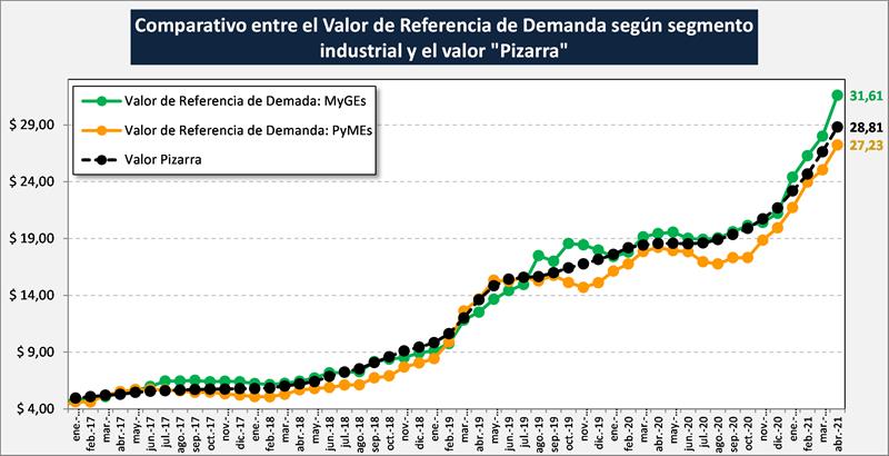 En el gráfico de abajo se subdivide la capacidad de pago o valor de referencia de demanda, entre las denominadas Megas y Grandes Empresas (MyGEs) y Pequeñas y Medianas Empresas (PyMEs).