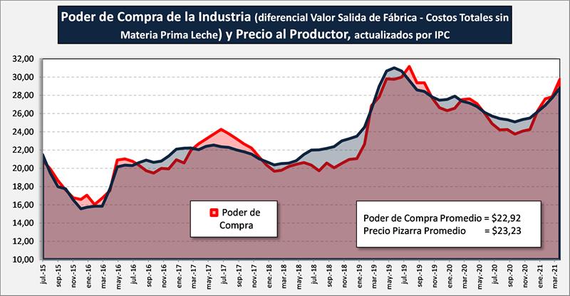 Viendo el precio pizarra liquidado y comparado con la capacidad de pago promedio de la industria, actualizada por IPC, para un período más prolongado, puede observarse que en el largo plazo (salvo oscilaciones temporales) los valores promedio convergen: $ 23,23 por litro de Precio Pizarra y $ 22,92 por litro de Poder de Compra.