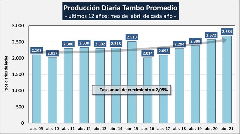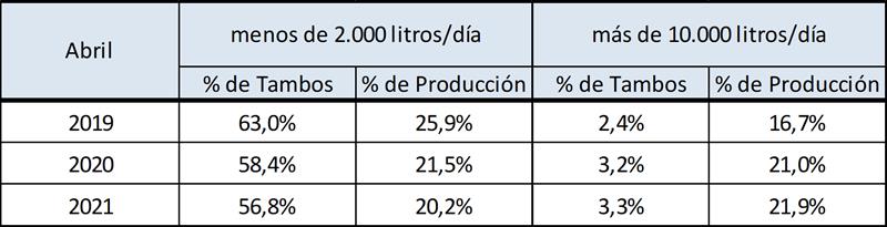 Estructura de la producción primaria – abril 2021 28/5/2021Estratificación de Tambos En el cuadro se presenta la participación de los tambos en función a su tamaño medido en litros de leche diarios del mes de abril del 2021 sobre la base SIGLeA: ![]() Puede observarse que los aproximadamente 330 tambos del estrato de + de 10.000 litros de producción diaria, que produjeron durante el mes de abril un promedio de 17.869 litros diarios, representan el 3,3% del total de tambos y aportan el 21,9% de la producción total. Esto es más leche que la que aportan los casi 5.700 tambos de menos de 2.000 litros diarios y que son el 56,8% de los tambos totales, que representan el 20,2% de la producción nacional. Concentración en unidades productivas más grandes Puede verse que en los meses de abril de los últimos tres años (2019-2021), que en un extremo disminuye la participación tanto en tambos como en producción de las unidades productivas de menos de 2.000 litros diarios y en el otro se incrementa la participación de las unidades de más de 10.000 litros diarios. ![]() El proceso de concentración de la producción en tambos más grandes es continuo, y mencionarlo no es naturalizarlo, sino mostrar una tendencia contundente y generalizada en la lechería mundial que los números marcan (sin hacer juicio de valor si ello es bueno o malo). Esa concentración en Argentina se expresa, con tasas de alrededor del 3% anual. Según la información que hemos publicado en OCLA en base al World Dairy Situation de la Federación Internacional de Lechería 2019 (FIL/IDF), muestran una tasa para los principales países lecheros del mundo algo por encima del 4% de reducción anual de tambos. El Tambo Promedio Mensual Sobre la base de la producción mensual y la cantidad anual de tambos (SENASA), podemos inferir el tamaño del tambo promedio, unos 2.684 litros de leche diarios para abril del 2021, un 4,4% más que el año anterior. Si evaluamos su comportamiento en el tiempo, a pesar de la disminución en el número de unidades productivas y en el número de vacas, el tambo promedio presenta en el período 2009-2021 una tasa de crecimiento acumulada anual del 2,05% lo que permite, a pesar de la reducción en las unidades productivas y en el rodeo, el sostenimiento de los niveles productivos agregados a nivel país. ![]() Incluso si tomamos el período 2016-2021 el crecimiento fue del 33,3% en 5 años para el promedio de producción por tambo en el mes de abril (tasa del 5,9% anual). La serie de cantidad de tambos (SENASA) utilizada para los cálculos de la producción por tambo, es la única disponible y a pesar de conocer algunas falencias en el relevamiento de la información, el criterio se mantiene en el tiempo y nos permite evaluar la tendencia. En caso de existir una fuente de información mejor, obviamente no proveniente de estimaciones o supuestos, la incorporaremos en nuestro análisis. El Tambo Promedio por Provincia SIGLeA – LUME, producción diaria últimos 12 meses ![]() La producción promedio diaria por tambo y por provincia que graficamos aquí es la que arrojan los datos de SIGLeA – LUME sobre 8.117 liquidaciones de leche mensuales (358 industrias). elaborado por el OCLA sobre información de la DNL-MAGyP y SENASA