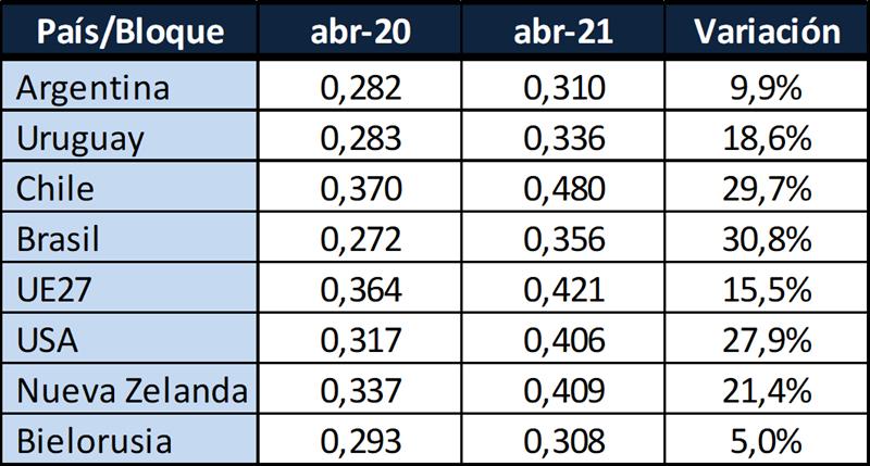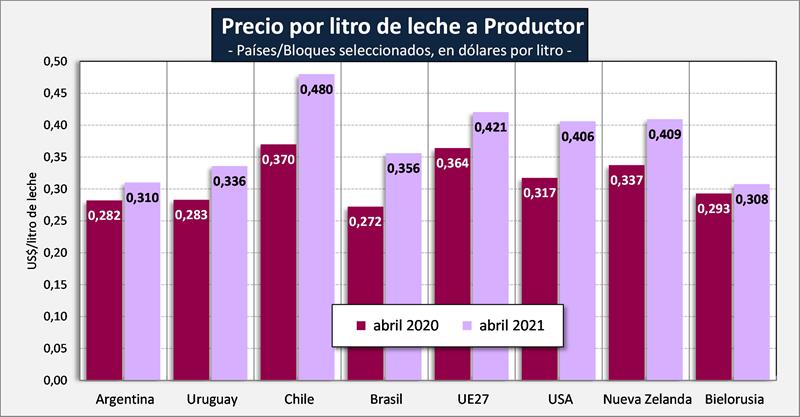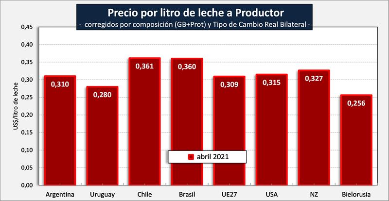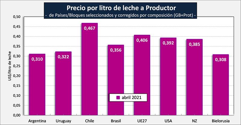 Observaciones: los precios en el gráfico de arriba han sido corregidos sólo por sólidos útiles (grasa butirosa y proteína) y no por el resto de componentes que hacen a la calidad higiénica y sanitaria, ni tampoco por tipo de cambio real bilateral con cada uno de esos países/bloques.
