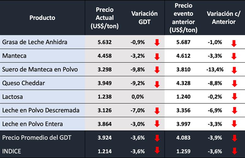 -GDT Price Index indica el promedio del cambio porcentual en los precios para cada especificación, ponderado por la cantidad de cada especificación vendida. GDT proporciona un cambio en el índice de precios de GDT del evento anterior para todos los productos, además de un equivalente para cada grupo de productos y cada combinación de grupo de productos/período de contrato. El índice de precios proporciona un reflejo más preciso de los movimientos de precios entre los eventos comerciales.